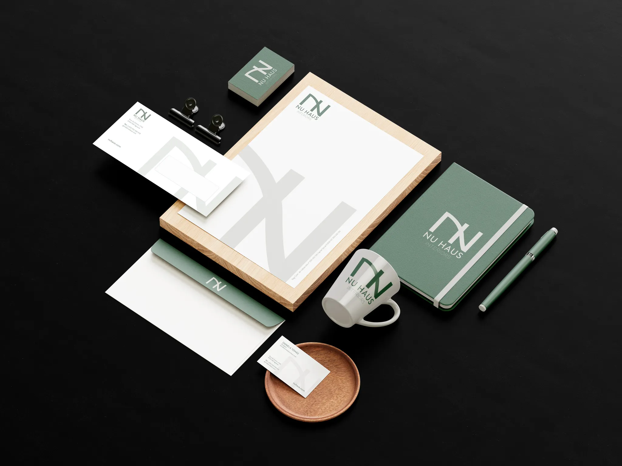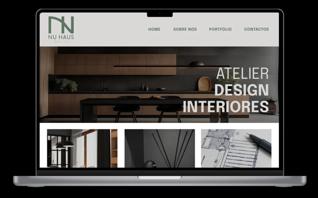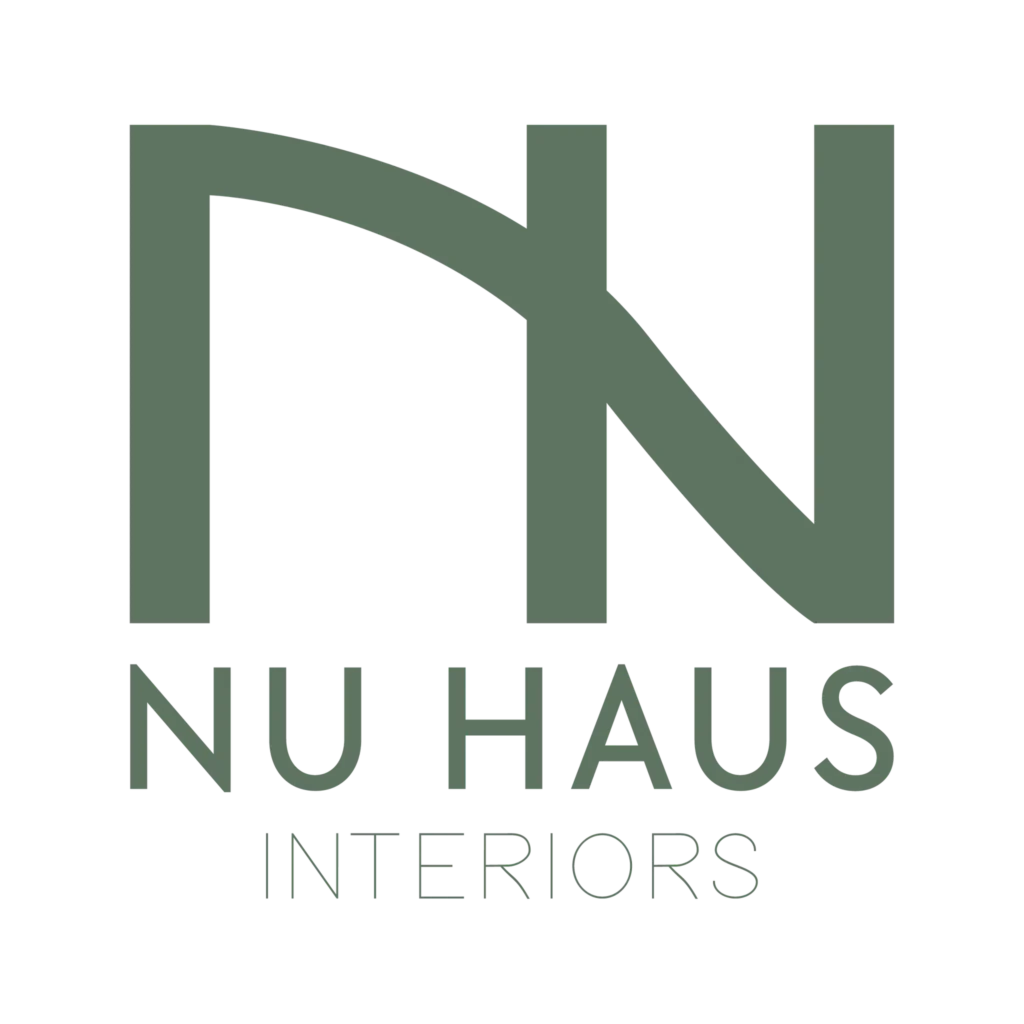 A tipografia sem serifa reforça o caráter elegante e profissional da marca, enquanto o contraste discreto em “Interiors” acrescenta leveza e sofisticação. O conjunto cria uma identidade visual coesa, moderna e facilmente reconhecível, alinhada com os valores e o estilo da Nu Haus.